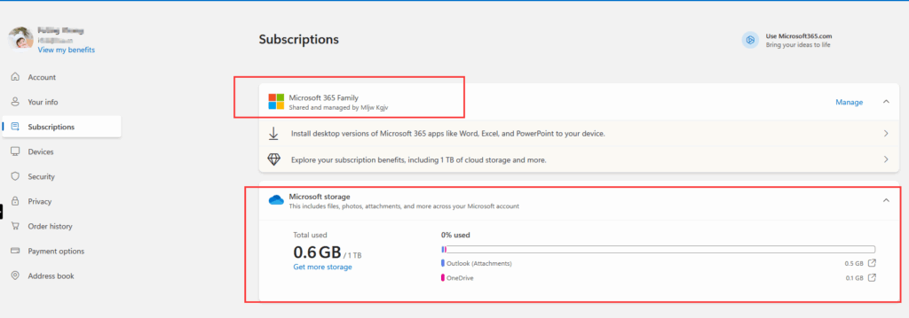 There, you’ll see your account details confirming your Microsoft 365 Family subscription and upgraded 1TB OneDrive storage.